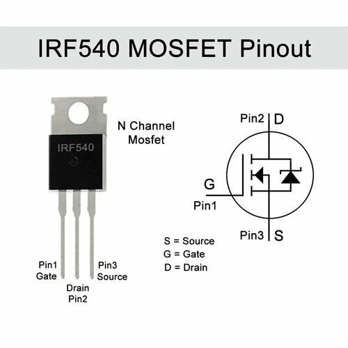The IRF540 is a powerful N-channel MOSFET designed for high-current switching and power management applications. It is widely used in circuits requiring efficient switching of high currents and voltages, such as motor drivers, power supplies, and inverters.